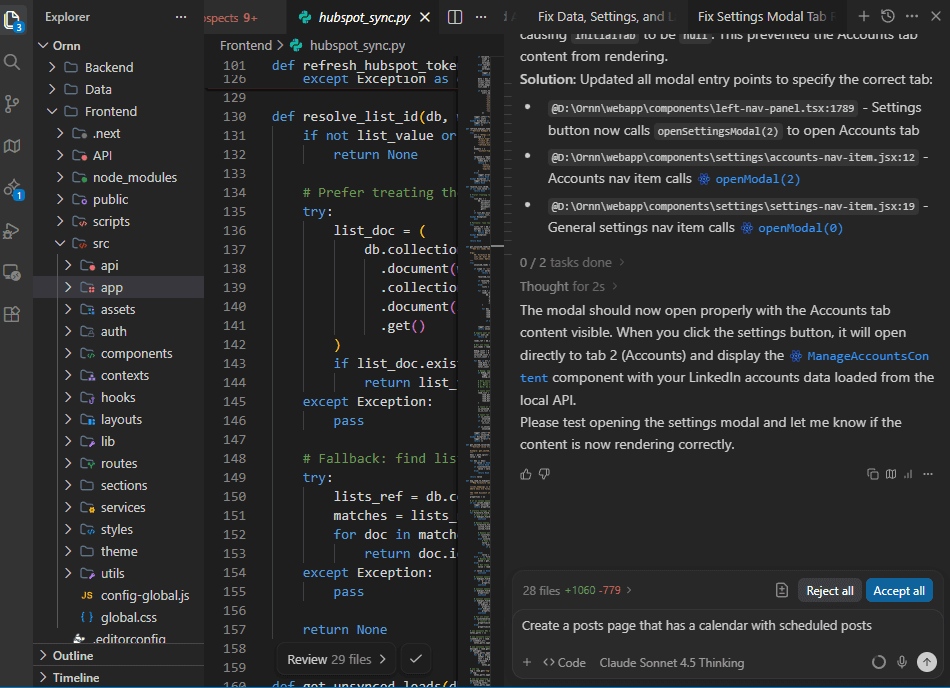 - webapp/├── api/│ └── craft-messages-api.ts├── app/│ ├── api/│ │ └── data/│ │ ├── users/│ │ │ └── [userId]/│ │ └── workspaces/│ │ └── [workspaceId]/│ ├── campaigns/│ │ ├── campaigns-content.jsx│ │ ├── campaigns-page-content.jsx│ │ ├── layout.jsx│ │ ├── loading.jsx│ │ └── page.tsx│ ├── prospects/│ │ ├── layout.jsx│ │ ├── loading.jsx│ │ ├── page.tsx│ │ ├── page_ui_backup.jsx│ │ └── prospects-checkbox-fix.css│ ├── favicon.ico│ ├── globals.css│ ├── layout.tsx│ └── page.tsx├── assets/│ └── data/│ ├── countries.js│ └── index.ts├── auth/│ ├── guard/│ │ ├── auth-guard.tsx│ │ ├── country-guard.tsx│ │ └── index.ts│ └── hooks/│ ├── index.ts│ └── use-auth-context.tsx├── components/│ ├── approvals/│ │ └── approvals-modal.tsx│ ├── automation-status-bar/│ │ ├── automation-status-bar.jsx│ │ ├── automation-status-bar.tsx│ │ └── index.js│ ├── campaign-workflow/│ │ ├── campaign-workflow-builder.jsx│ │ └── workflow-nodes.jsx│ ├── company-selection/│ │ └── index.tsx│ ├── country-select/│ │ ├── country-select.jsx│ │ └── index.js│ ├── custom-icon/│ │ └── custom-icon.tsx│ ├── desktop-leads-summary/│ │ ├── desktop-leads-summary-widget.jsx│ │ └── index.js│ ├── flag-icon/│ │ └── index.tsx│ ├── global-header/│ │ └── global-header.tsx│ ├── iconify/│ ├── import-popover/│ │ └── import-popover.tsx│ ├── lead-chat-popup/│ │ ├── lead-chat-popup.jsx│ │ └── lead-chat-popup-clean.jsx│ ├── lead-info-drawer-hub/│ │ ├── index.js│ │ └── lead-info-drawer-hub.jsx│ ├── left-nav-panel/│ │ └── manage-accounts-modal.tsx│ ├── mobile-block/│ │ └── mobile-block.tsx│ ├── mobile-leads-tiles/│ │ ├── leads-summary-widget.jsx│ │ ├── mobile-leads-tiles.jsx│ │ └── mobile-leads-tiles.tsx│ ├── modern-leads-table/│ │ ├── combined-filter-popover.jsx│ │ ├── modern-leads-table.jsx│ │ └── modern-leads-table-new.jsx│ ├── no-contact-popover/│ │ ├── no-contact-popover.jsx│ │ └── no-contact-popover.tsx│ ├── personalize-popover/│ │ ├── index.js│ │ └── personalize-popover.jsx│ ├── profile-avatar/│ │ ├── index.js│ │ └── profile-avatar.jsx│ ├── rewriting-status-bar/│ │ ├── index.js│ │ └── rewriting-status-bar.jsx│ ├── scraping-status-bar/│ │ └── scraping-status-bar.jsx│ ├── settings/│ │ ├── context/│ │ │ ├── index.js│ │ │ ├── settings-context.js│ │ │ ├── settings-context.tsx│ │ │ ├── settings-provider.jsx│ │ │ └── use-settings-context.js│ │ ├── drawer/│ │ │ ├── base-option.jsx│ │ │ ├── font-options.jsx│ │ │ ├── fullscreen-button.jsx│ │ │ ├── index.js│ │ │ ├── nav-layout-option.jsx│ │ │ ├── presets-options.jsx│ │ │ ├── settings-drawer.jsx│ │ │ ├── settings-drawer.tsx│ │ │ └── styles.jsx│ │ ├── accounts-modal.jsx│ │ ├── accounts-modal.tsx│ │ ├── accounts-nav-item.jsx│ │ ├── campaigns-tab-content.jsx│ │ ├── config-settings.js│ │ ├── find-leads-modal.jsx│ │ ├── find-leads-modal.tsx│ │ ├── hubspot-integration-content.jsx│ │ ├── index.js│ │ ├── index.tsx│ │ ├── integrations-content.jsx│ │ ├── integrations-modal.jsx│ │ ├── integrations-modal.tsx│ │ ├── palette-picker-content.jsx│ │ ├── server.js│ │ ├── settings-config.js│ │ ├── settings-content.jsx│ │ ├── settings-inline-view.jsx│ │ ├── settings-inline-view.tsx│ │ ├── settings-modal.jsx│ │ ├── settings-nav-item.jsx│ │ ├── smartlead-integration-content.jsx│ │ ├── smartlead-webhook-content.jsx│ │ ├── smartlead-webhook-management-content.jsx│ │ ├── subscription-content.jsx│ │ ├── subscription-pricing-content.jsx│ │ ├── theme-modal.jsx│ │ ├── theme-modal.tsx│ │ ├── webhook-management.jsx│ │ └── webhook-management-content.jsx│ ├── webhook-management-modal/│ │ └── webhook-management-modal.tsx│ ├── custom-icon.tsx│ ├── iconify.tsx│ ├── lead-info-drawer-hub.tsx│ ├── left-nav-panel.tsx│ ├── manage-accounts-content.tsx│ ├── personalize-popover.tsx│ └── theme-provider.tsx├── contexts/│ ├── drawer-context.tsx│ ├── settings-modal-context.tsx│ ├── status-bar-context.tsx│ ├── user-initiated-context.tsx│ └── workspace-context.tsx├── data/│ └── index.ts├── hooks/│ ├── use-accent.js│ ├── use-accent.ts│ ├── use-boolean.js│ ├── use-boolean.ts│ ├── use-cookies.js│ ├── useFirestoreData.ts│ ├── use-lazy-leads.ts│ └── use-leads-data.ts├── layouts/│ ├── components/│ │ └── trial-expiration-modal.tsx│ ├── core/│ │ ├── header-section.tsx│ │ ├── layout-section.tsx│ │ └── main-section.tsx│ ├── dashboard/│ │ └── css-vars.ts│ └── dashboard.tsx├── lib/│ ├── firebase.ts│ ├── firestore-stubs.ts│ └─