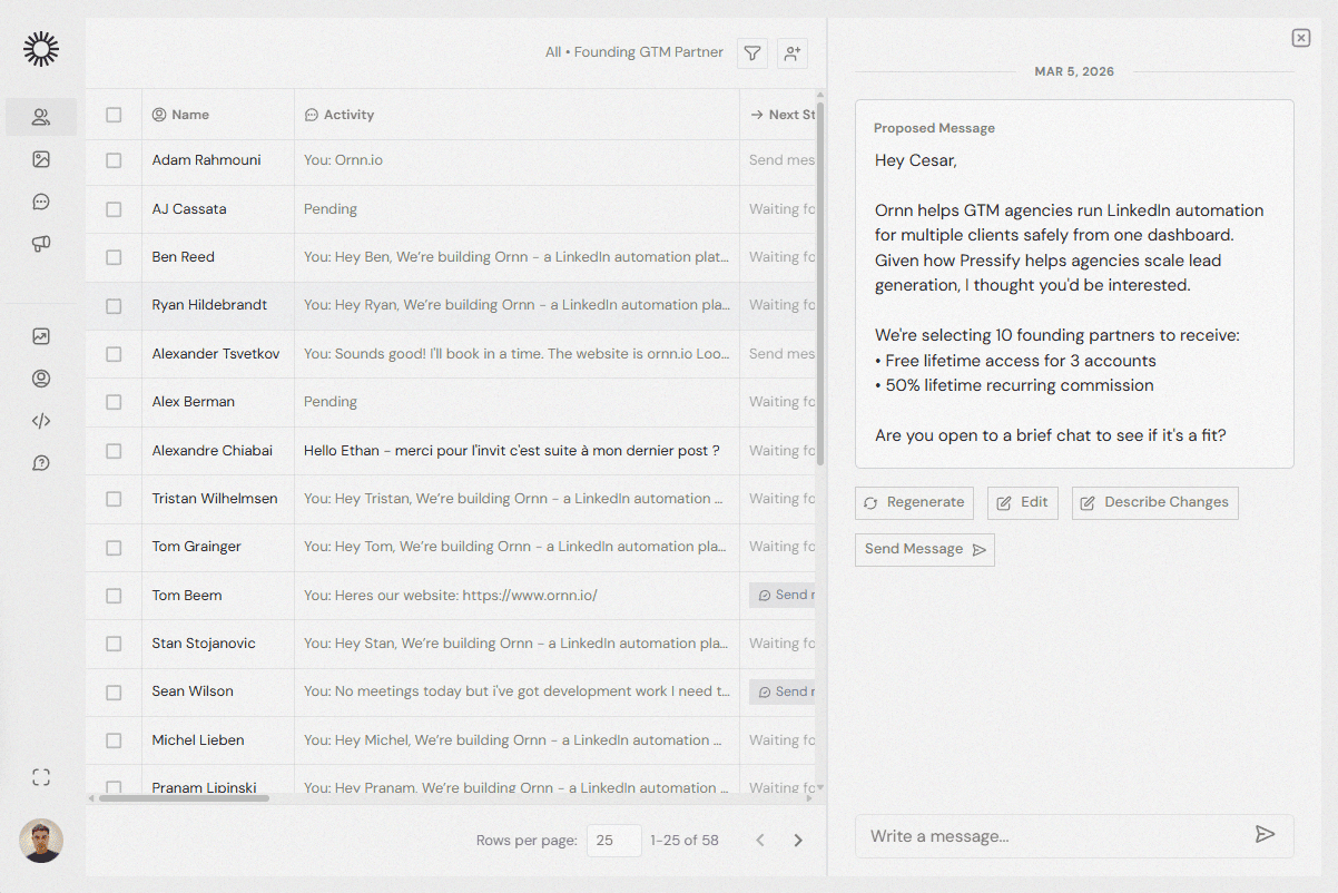 It’s a partnership for agencies and GTM experts to earn up to 50% recurring revenue, receive qualified leads, and get certified as LinkedIn Outreach Experts using Ornn.